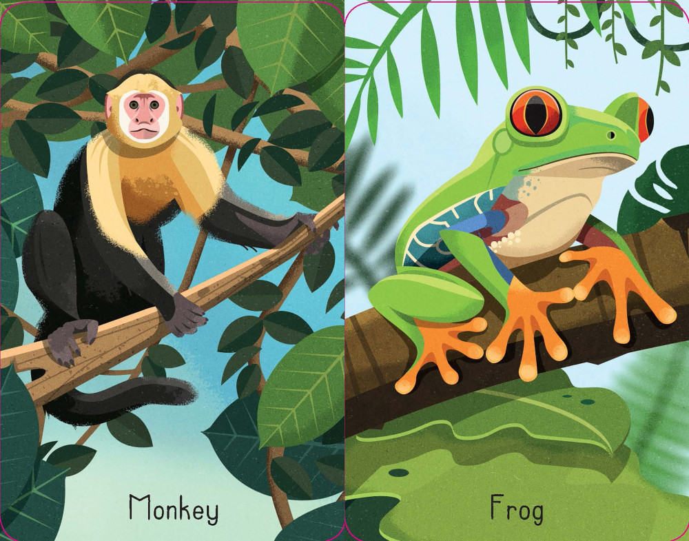 There are lots of jungle creatures and objects to match in this entertaining card game for young children. There are 52 snap cards (13 matching sets of 4), with labelled pictures showing a parrot, jaguar, monkey, sloth, chameleon and lots more. The game can be played with fewer cards to make it easier for younger players to join in.